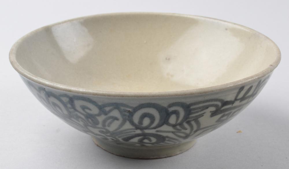 A small glazed porcelain wheel-thrown bowl with painted floral motifs.