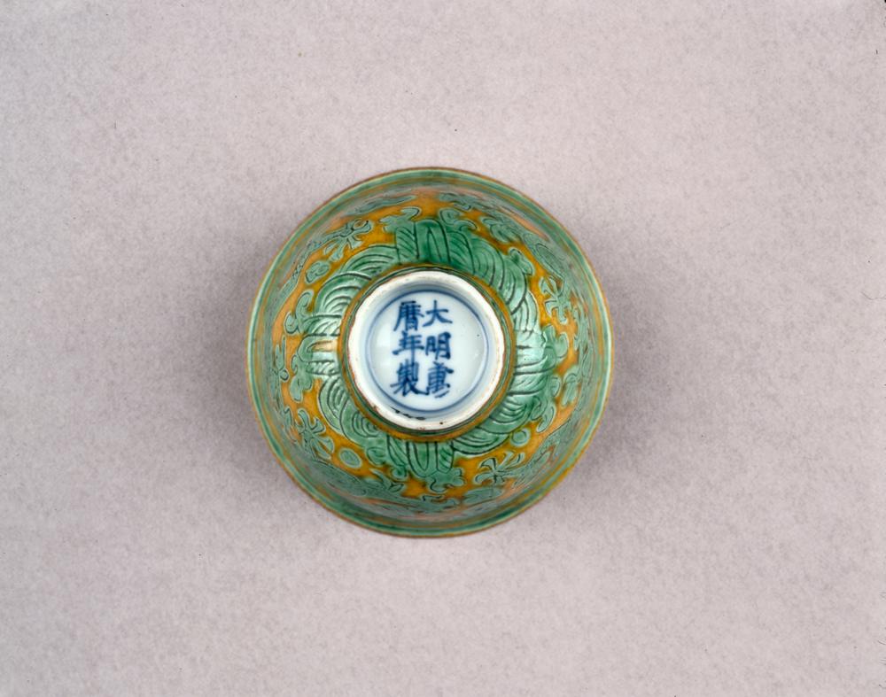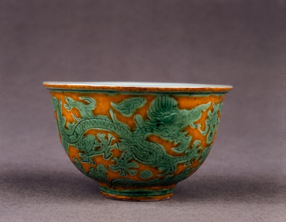 Comments:Published PDF date : Ming Wanli 1573-1620 Room 95 label text:PDF 746Cup with dragons chasing pearlsThis small cup is incised with a design of dragons chasing pearls among waves and clouds in green enamel against a yellow enamel ground. The base has a six-character underglaze cobalt-blue Wanli reign mark.Porcelain with incised decoration, underglaze cobalt-blue mark and green and yellow enamels Jingdezhen, Jiangxi province 江西省, 景德鎮Ming dynasty, Wanli mark and period, AD 1573–1620 PDF 746龍戲珠紋杯此小杯在黃地上刻劃海水雲龍戲珠圖案,並以綠彩填繪。器底署青花六字萬曆年款。瓷器,劃花,青花款,黃地綠彩江西省景德鎮明代,萬曆,萬曆款,1573-1620年