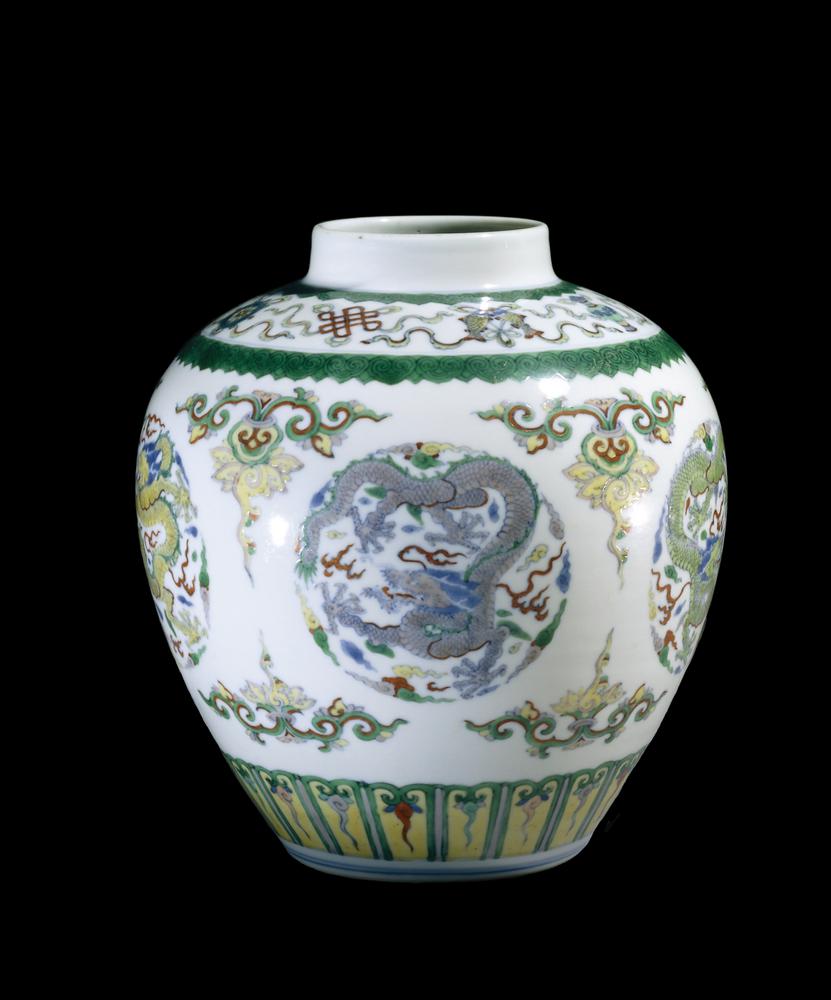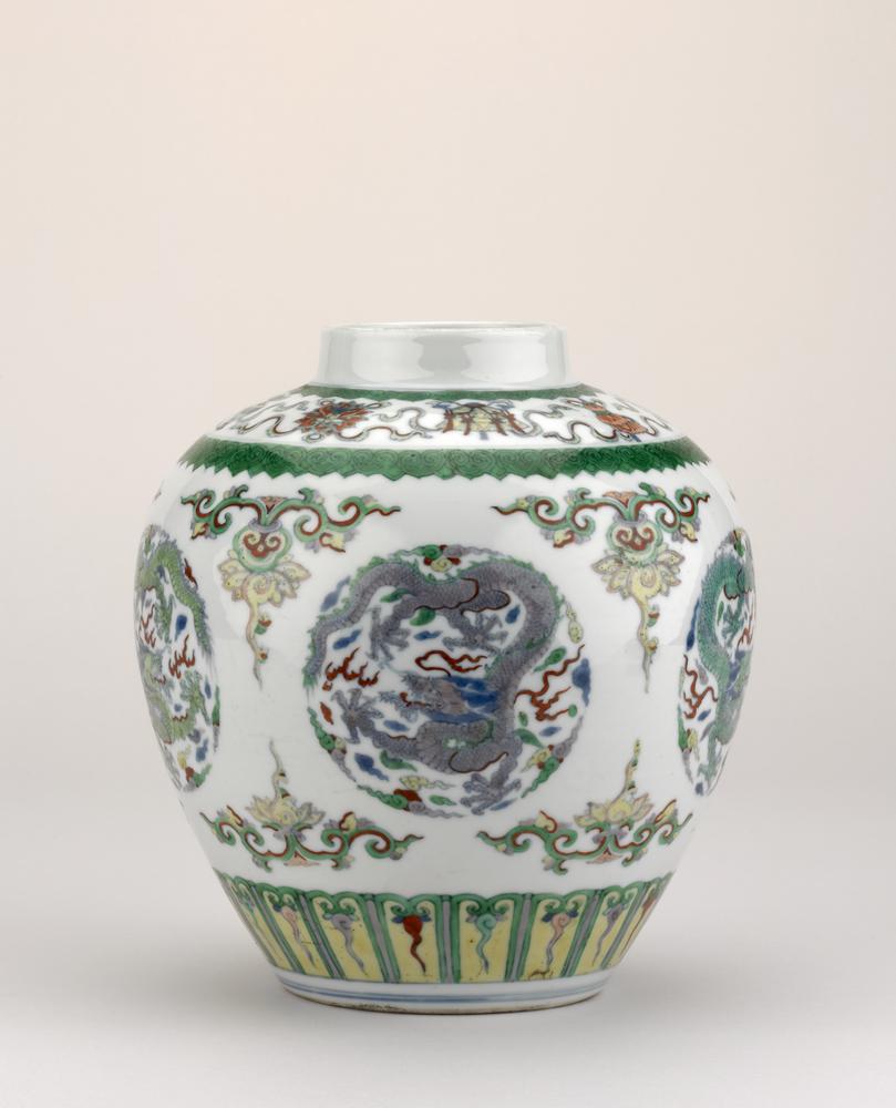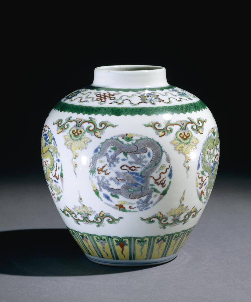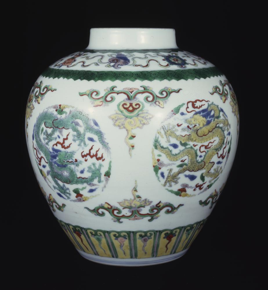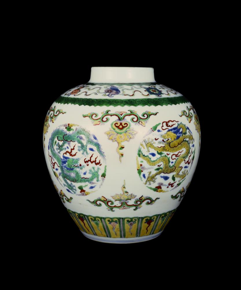 Jar. Made of porcelain, decorated in underglaze blue and overglaze enamel colours (doucai). Dragon. Mark.
